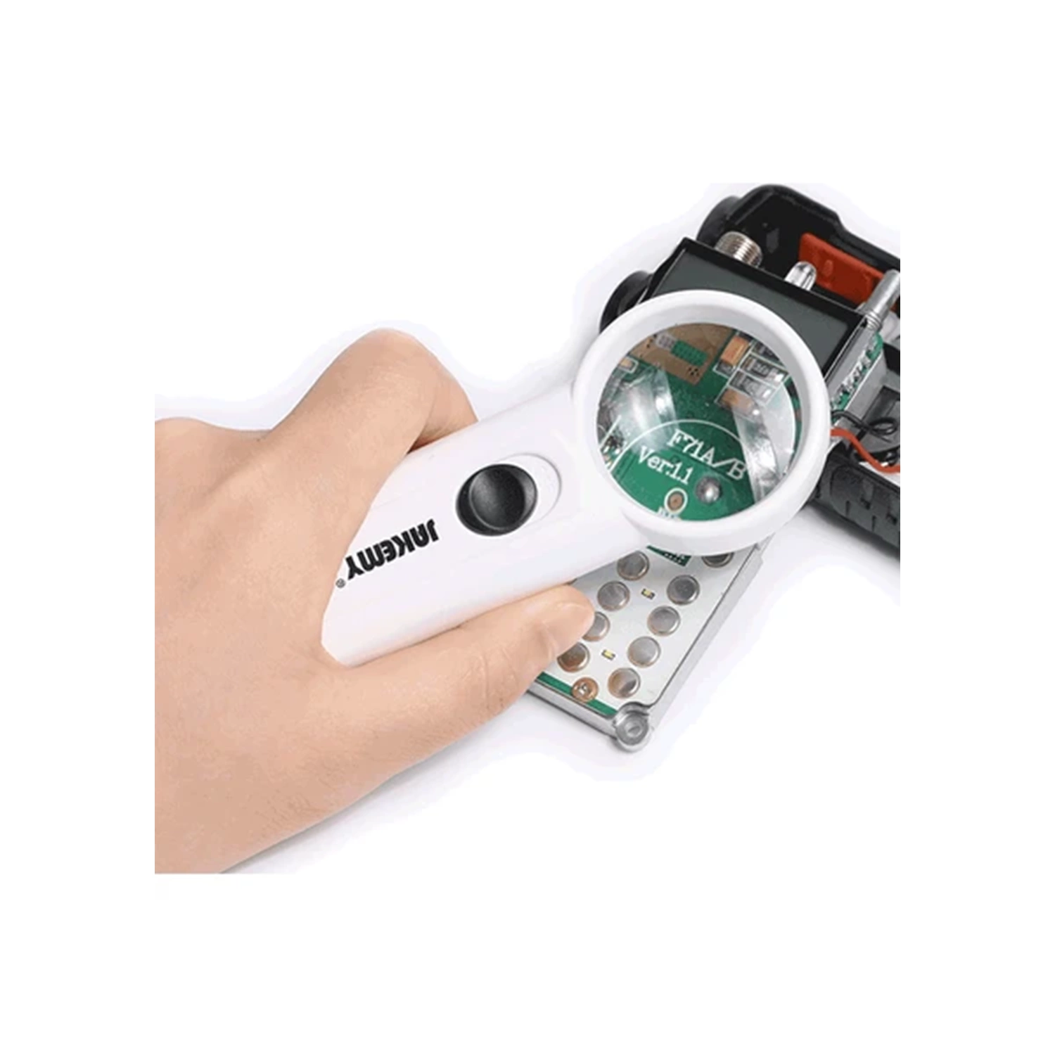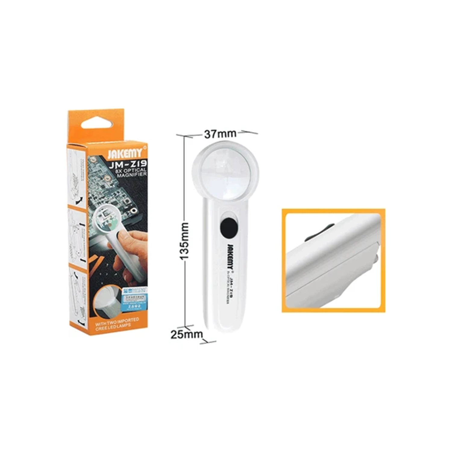 Uzun kullanım ömrü için sertleştirilmiş ABS ile imal edilen Jakemy JM-Z19 8X El Büyüteci; geniş çaptaki merceği ile nesneleri daha kolay ve net gözlemleyebilirsiniz. Tasarımına ilave dilen CRE LED'ler sayesinde ışıklı büyüteç ile karanlıkta dahi tüm ayrıntıları rahatlıkla inceleyebilirsiniz. Dikkat gerektiren detaylı işlerinizde kullanabileceğiniz el büyüteci 40 gram ağırlığı ile yanınızda rahatlıkla taşıyabileceğiniz bir tasarıma sahiptir. Işıklı olması avantajı ile kapalı, ışıksız mekanlarda tercih edilmektedir.